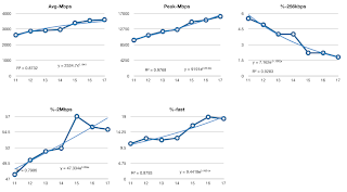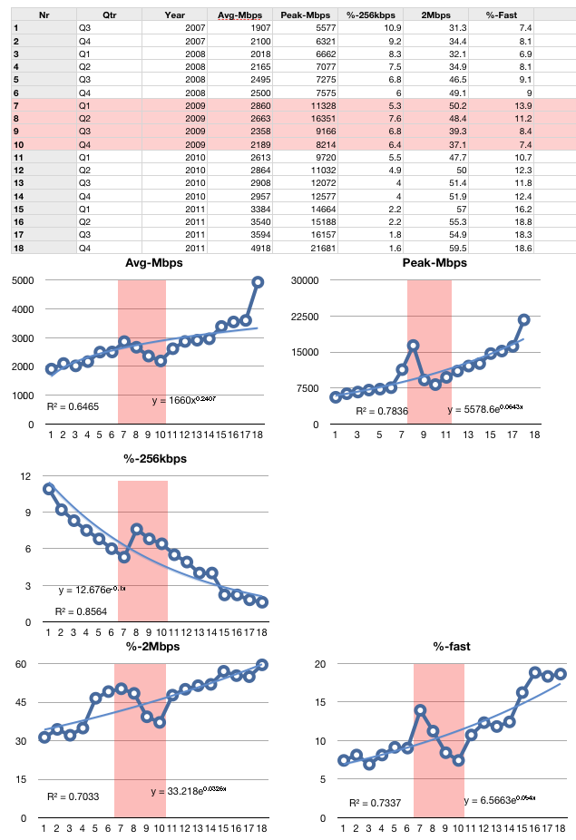 - For Q4 of 2011, there is a 37% increase in the average connection speed and 25% in Peak. This could be an artefact of the sampling, or due to structural changes due to better "backhaul" networks or consolidation of ISP's.