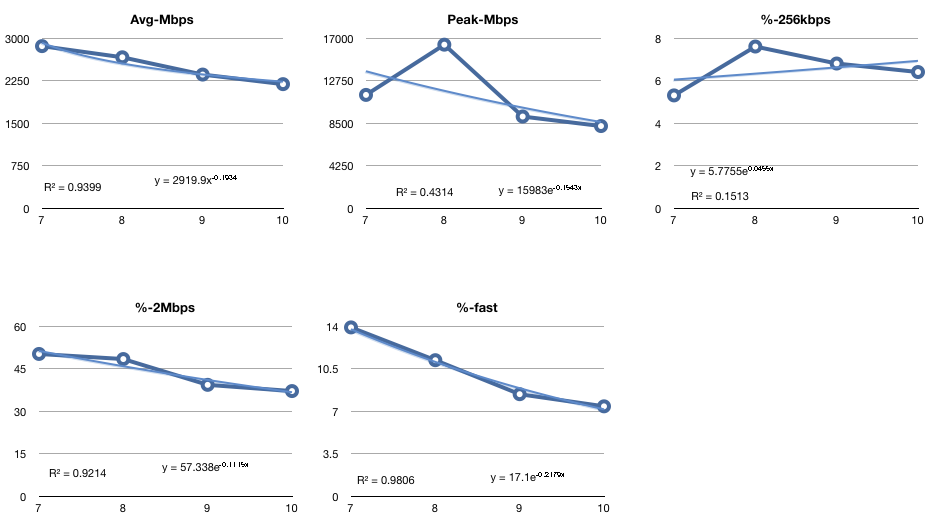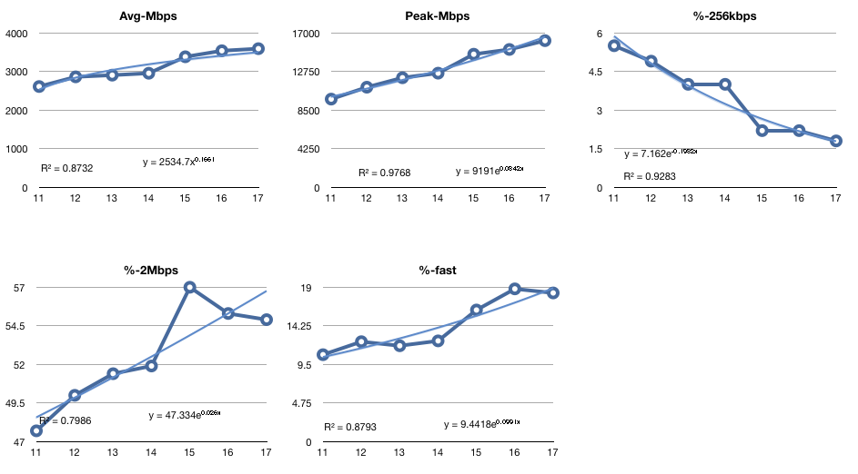 Update [28-May-2012]: Dr Neil Gunther has analysed the Akamai data as a Time Series, albeit a small one, and initial results are that it is approximately exponential growth, but the simple scatterplot trendline underestimates the forecast. The 2014 (2 year) projections, expressed as logarithm (kbps) are around 3.9 ± 0.3 [95% CI] and ± 0.2 [80% CI].